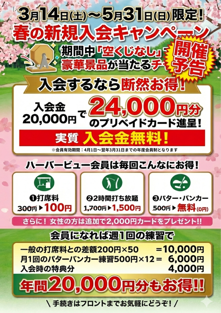 1.メンバーズ会員は通常の打席料300円のところ、100円になります。法人会員は無料になります。